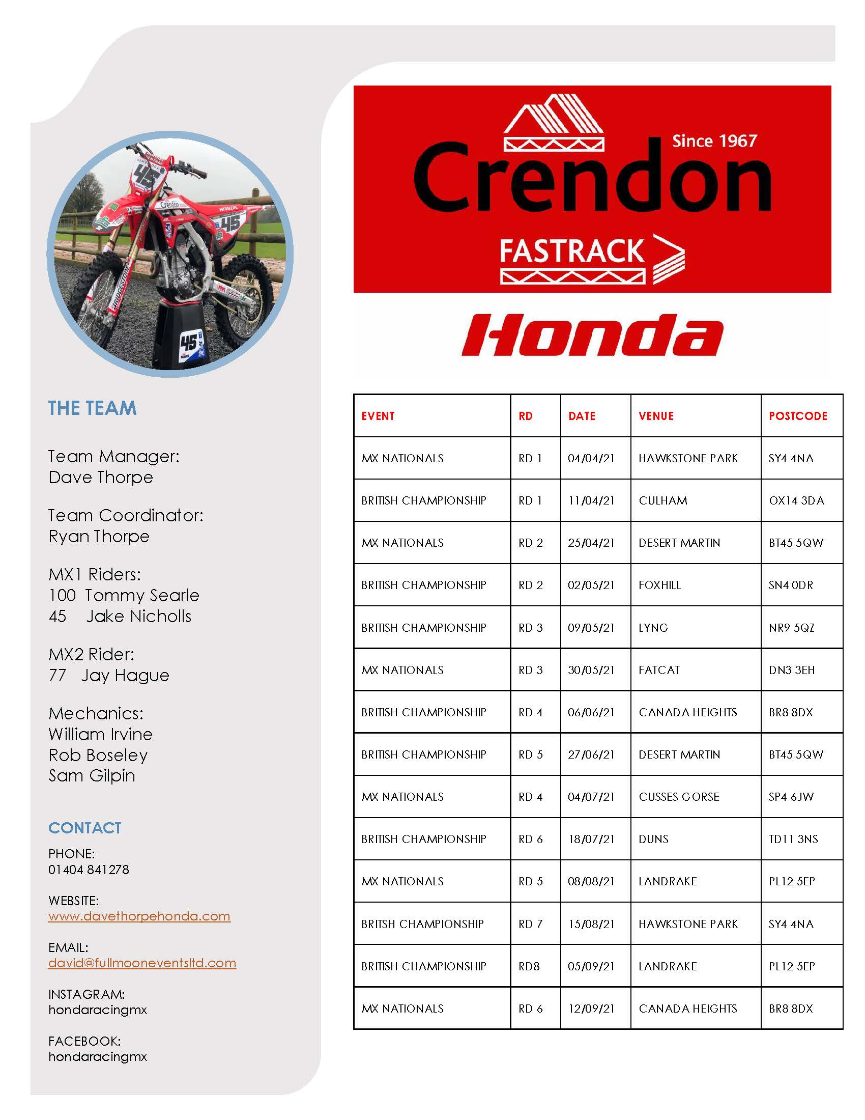 The Crendon Fastrack Honda team has confirmed it will contest the eight-round British Motocross Championship and six-round MX Nationals in 2021. Starting with the opening MX Nationals round at the legendary Hawkstone Park circuit in April, the team visits some of the greatest tracks across the UK. These include two trips to Desert Martin in Northern Ireland and Duns in Scotland in a schedule of the 14 biggest UK motocross events.