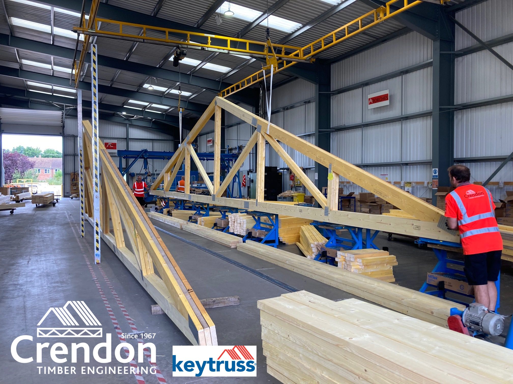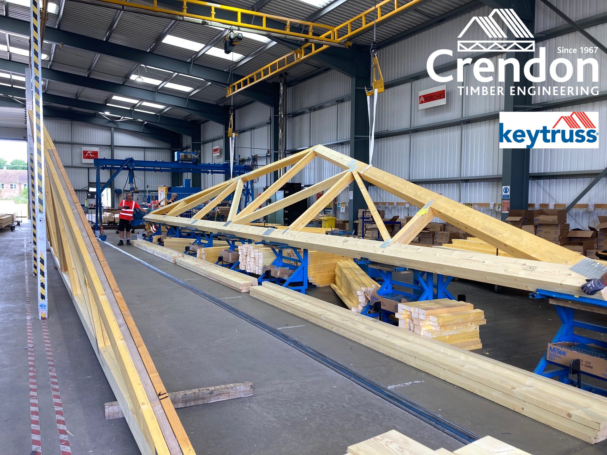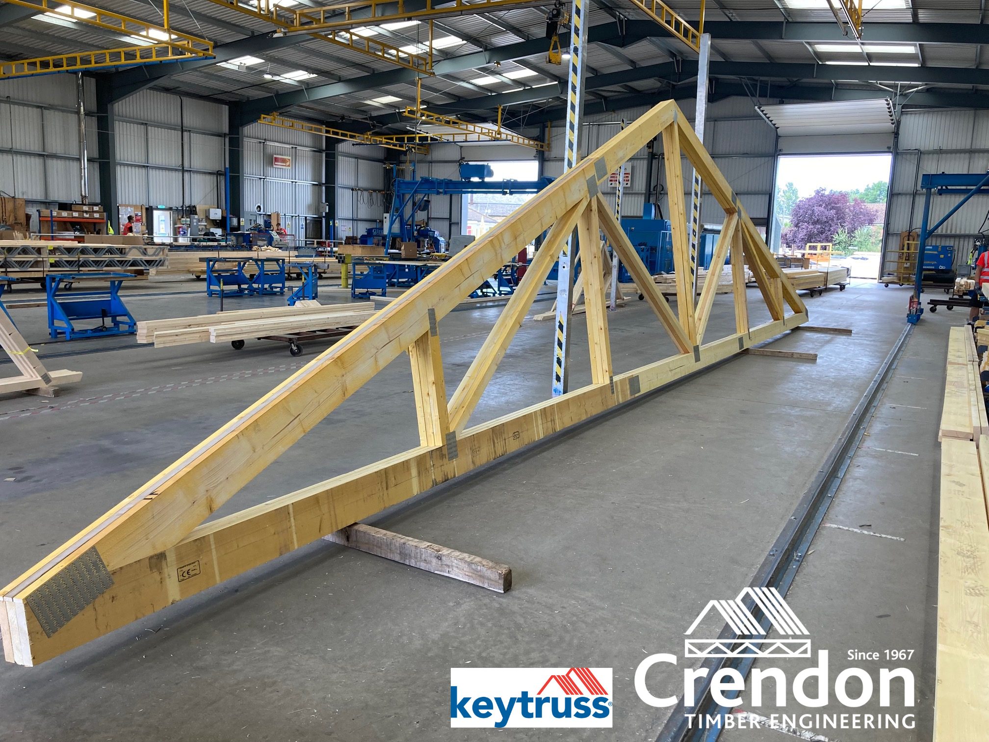 16m 3 Ply Factory Nailed Girder Trusses in production this week at Crendon East Harling all with bespoke designed metalwork fixings for New Stores, Training and Educational Facility in Haddenham
