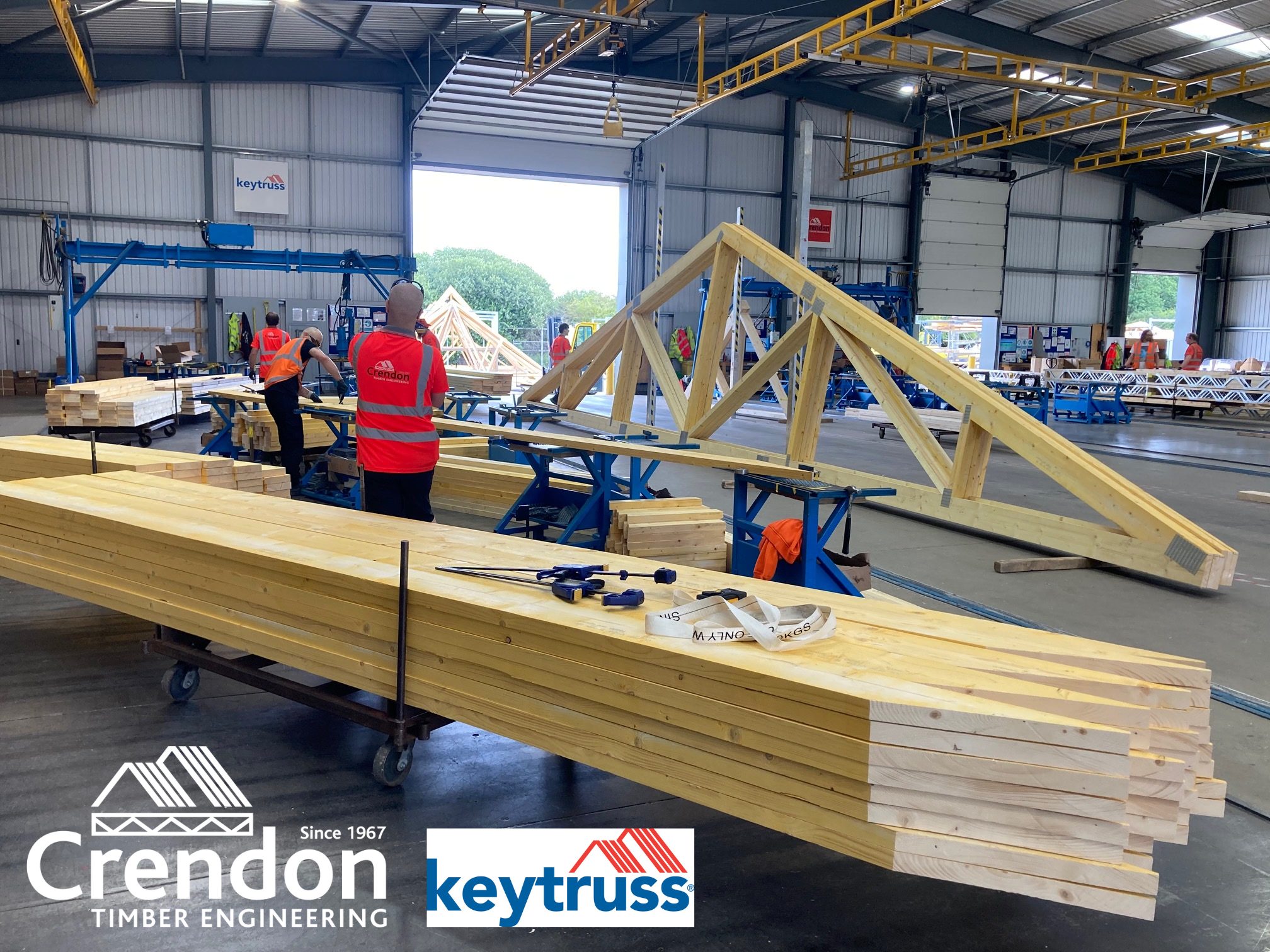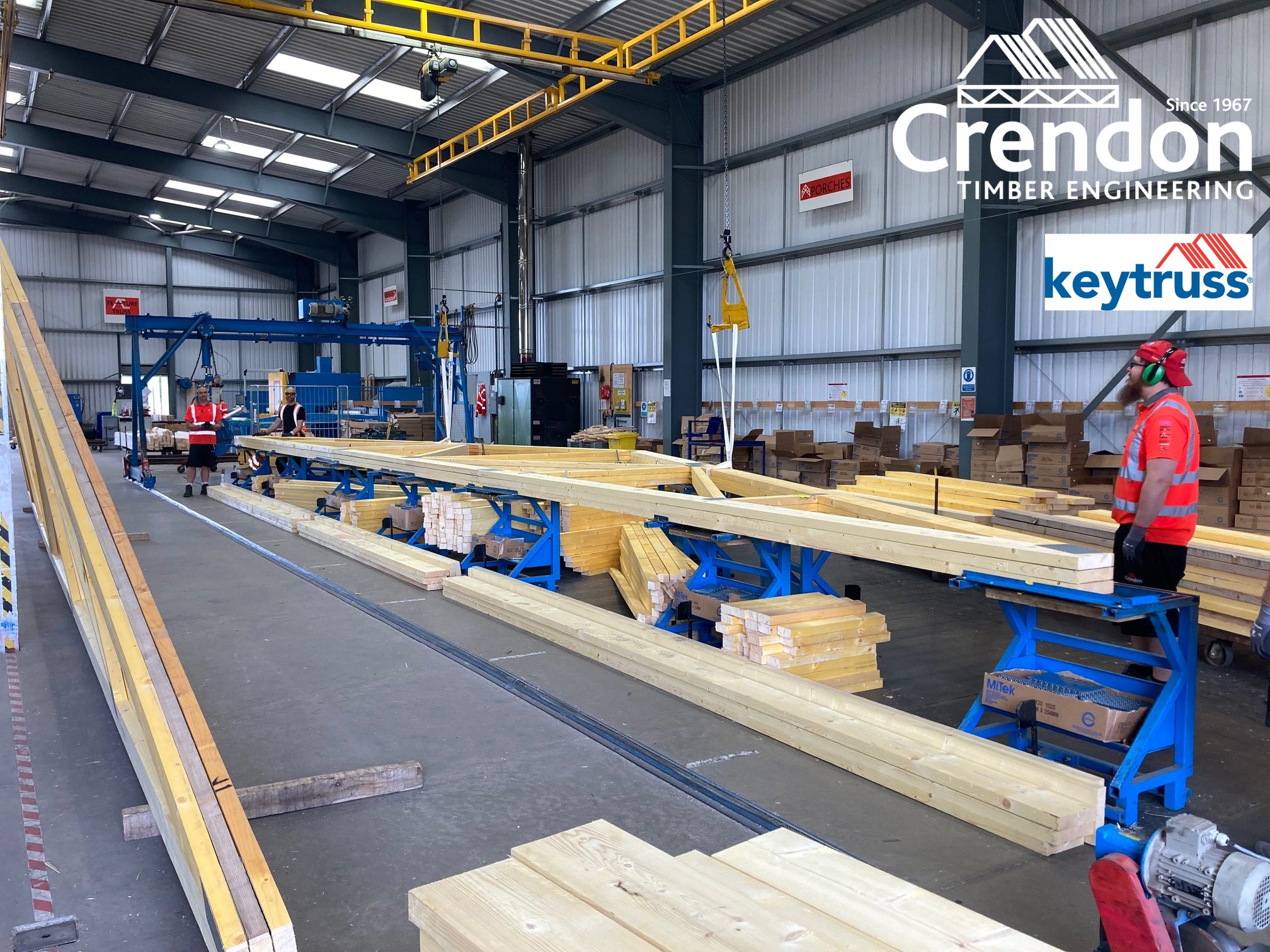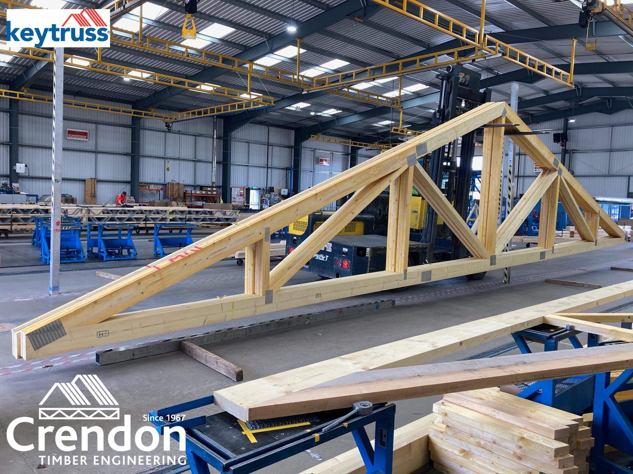 16m 3 Ply Factory Nailed Girder Trusses in production this week at Crendon East Harling all with bespoke designed metalwork fixings for New Stores, Training and Educational Facility in Haddenham