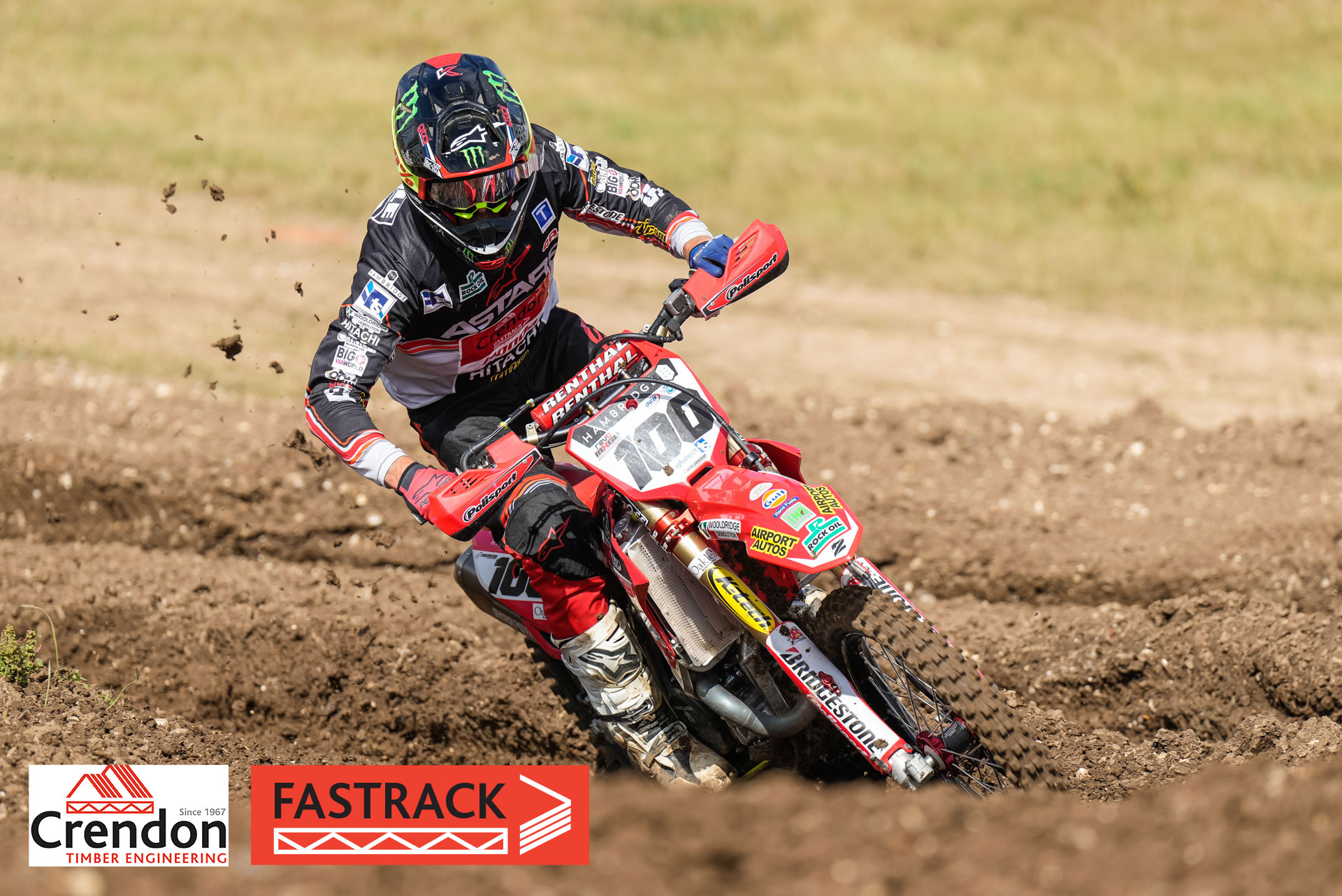 For an incredible eighth time this year, Crendon Fastrack Honda rider Tommy Searle ended on the podium of a national race in the MX Nationals at Cusses Gorse on Sunday. He took a fine second overall, only robbed of a stunning double win when a stone jammed his rear brake while he was leading the final moto.